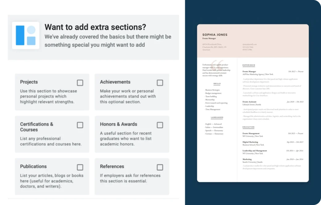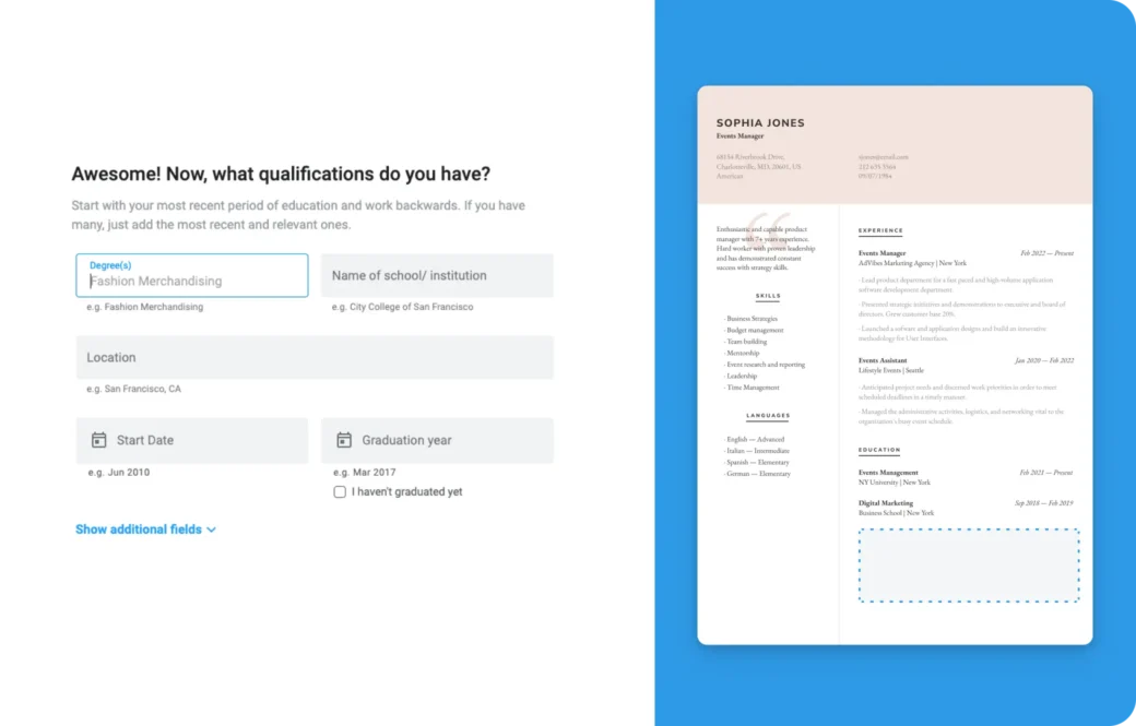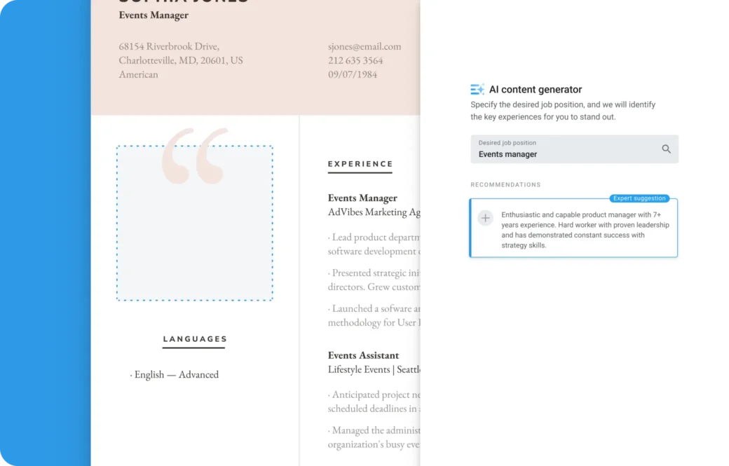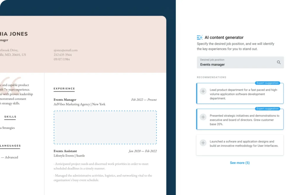 From technical skills to multilingual proficiency, our AI assistant will help you list the hard and soft skills that align most closely with your dream job’s requirements. If you speak multiple languages, remember to add your proficiency levels.