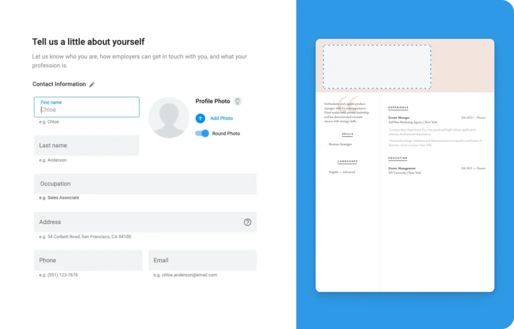 Our AI even supports photo inclusion, assessing how it complements your resume.